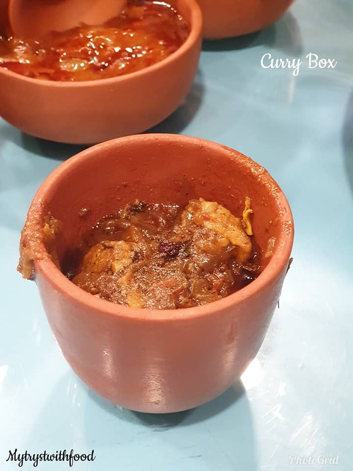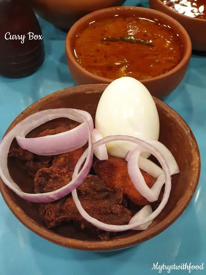 A friend and me ordered Non-Vegetarian Meals (₹100) and Curry Box Special Meals (₹250), respectively. There was no description in the Menu but the waiter was quick to explain the difference while placing the order. Now, the issue here is since both the Meals were brought together in Terracotta Pots, we weren’t sure which belonged to which type of Meals. If my memory serves right, Non-Vegetarian Meals comes with Mutton Chukka and My Curry Box comes with Chicken 65 & Egg. I’m sorry but it was too confusing so, I’ll go by with whatever I ate/tasted.