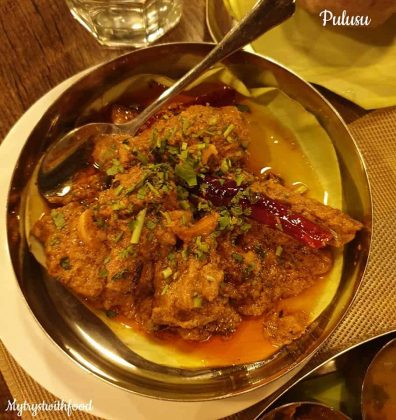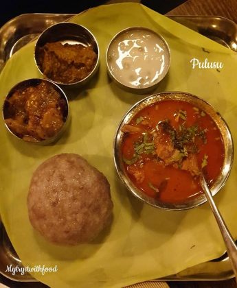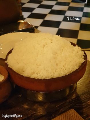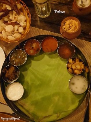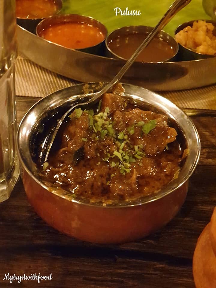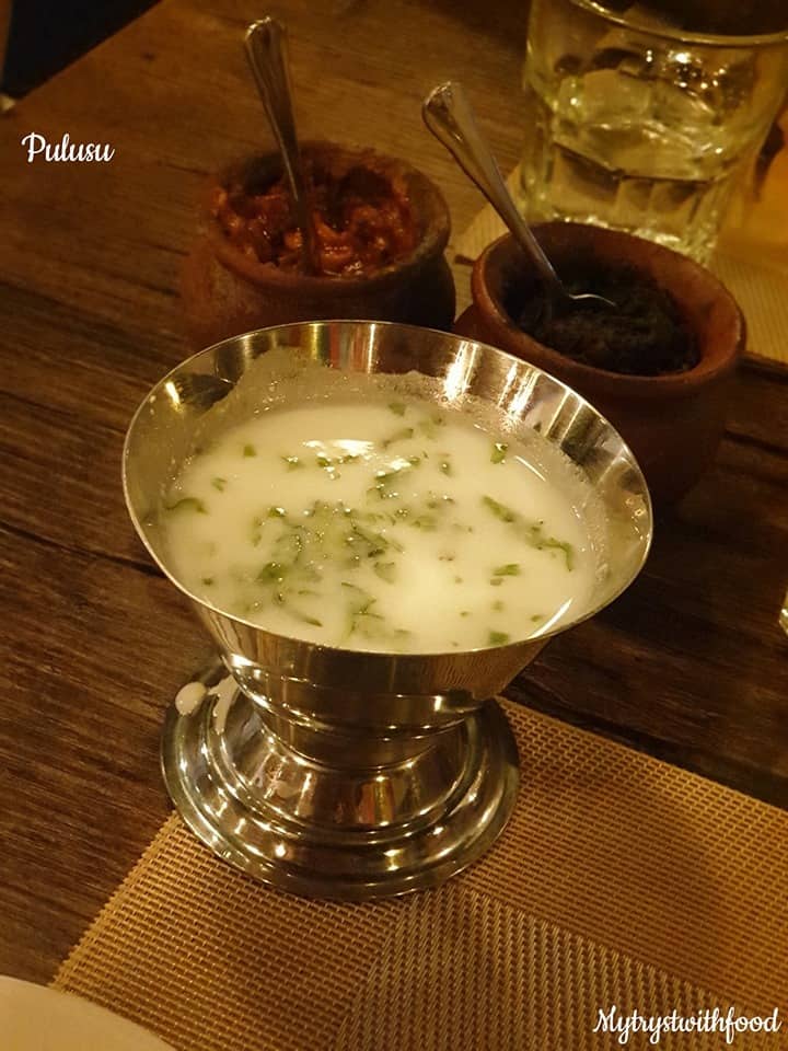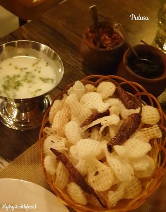 I have a weakness for the word ‘Pulusu’. The mere mention of this word makes me drool. It has the same effect on me that an image/vision of Pickle does – a direct connect to the senses that induces the effect called “Mouth Watering”. Okay, so when I was having my Rayalaseema food cravings I decided to give this place a shot. Overall, it wasn’t an overwhelming experience as I thought it would be. But, yeah… manageable. Buttermilk and Fryums are served on the house after you are seated.