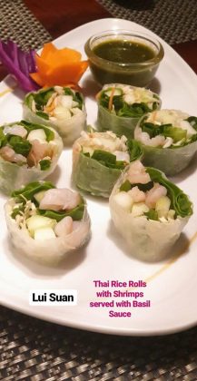1. Lui Suan: Stuffed Rice Rolls. The Roll had fresh veggies (uncooked except for the boiled Shrimps). One dip into the strong Basil Sauce it came with, the taste becomes heavenly.