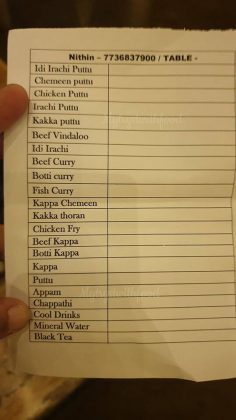 Kakka Thoran (₹80) was good. The beef in Beef Kappa (₹110) and Vindaloo (₹100) was so soft that it could have been easily mistaken for a soft cooked Mutton. Idi eraichi (₹100) vanished with in few minutes of it being served. The crispy Chicken Fry (₹80) with it’s coconut oil flavor stood out and we ended up ordering more of it.