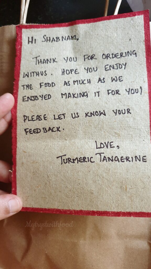 Harsha Vardhini, the face behind Turmeric Tangerine is a passionate home chef. And, I can now vouch for it after having tasted her food. She has been making Artisinal Condiments. And, that’s how I ended up visiting her Instagram page. The Menu is limited, you can order any dish from the Menu. Me being me, ordered everything in the Menu, which was a GOOD meal for two.