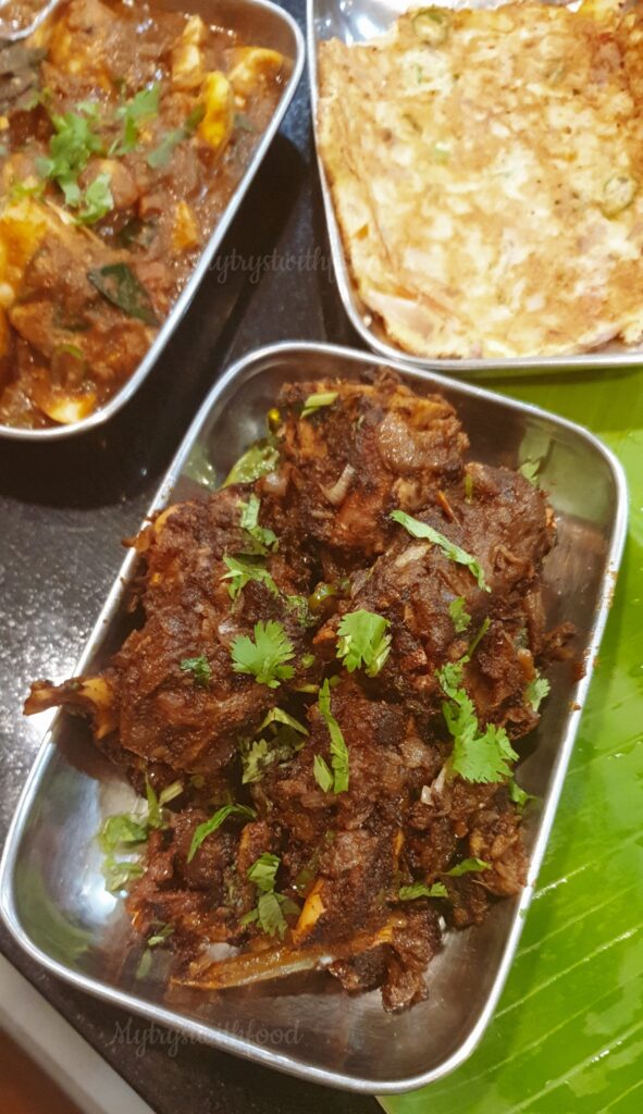 I actually regretted when the glass of Kozhi Rasam (₹40) got over, it was that good. Chicken Kola (₹33/pc) was good. I settled for Cup Meals (₹80) against the elaborate Erode Special Vegetarian Meals (₹135) but the waiter who was serving was generous enough to give me some Podi and the Ennai Kathrikai Kozhambu which is a personal favorite. Use of generous amount of Whole Garlic made the Annur Chicken Kozhambu (₹225) an irresistible combination with the Plain Rice. Mutton Nalli Fry (₹280) can be easily called as their Star Dish. Everything about it was spot-on. Muttai Mass (₹90) was loved by all. I relished the Thenga Ennai Omelette (₹35) with my meals.