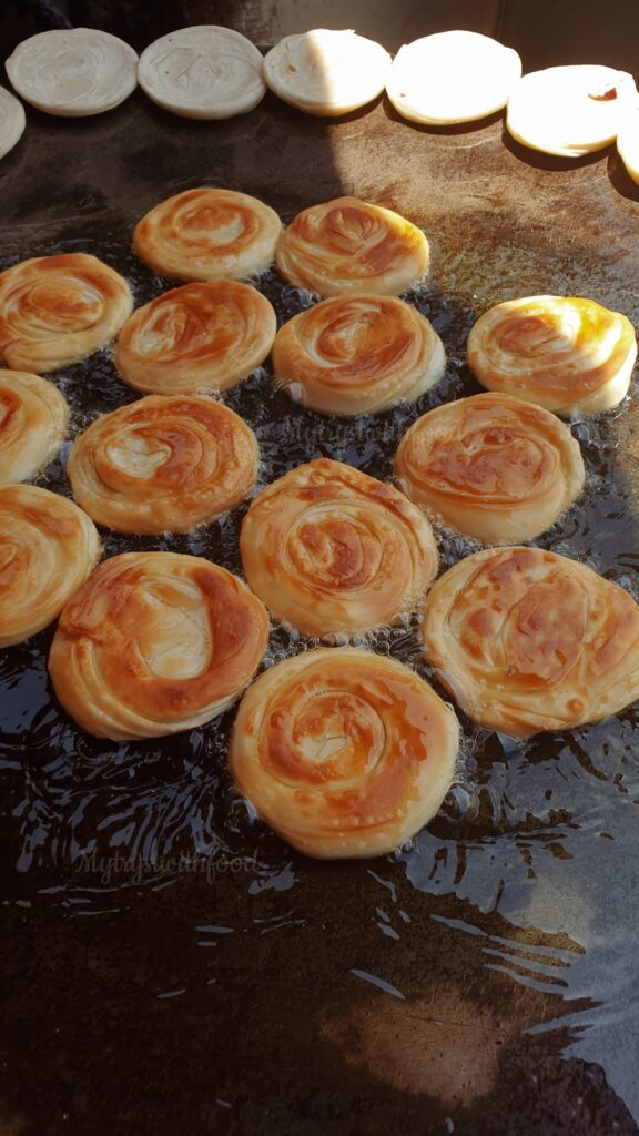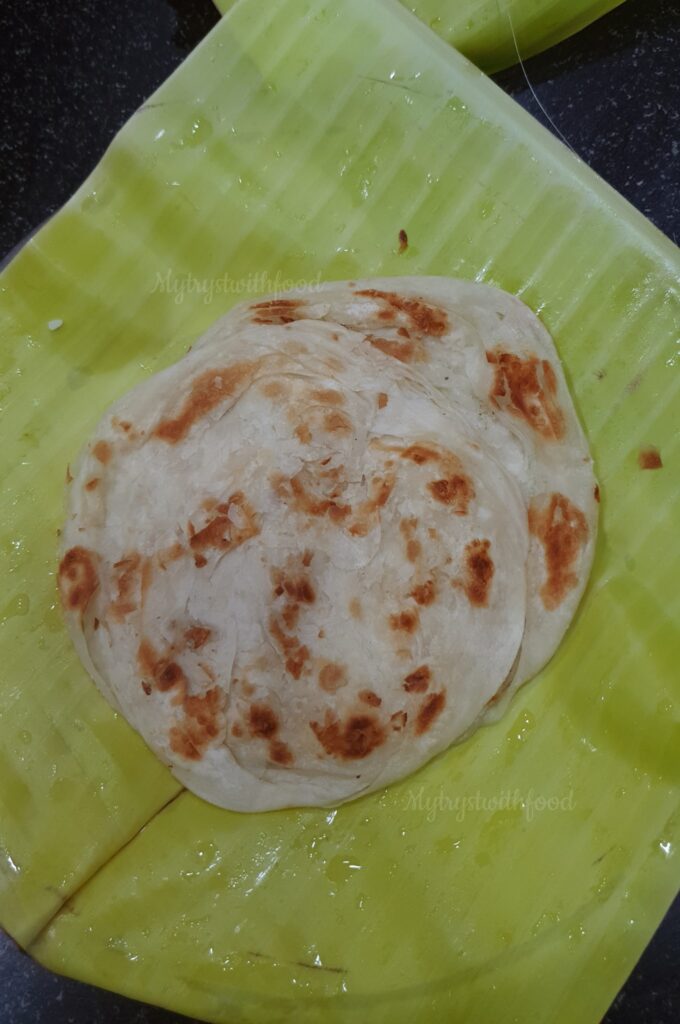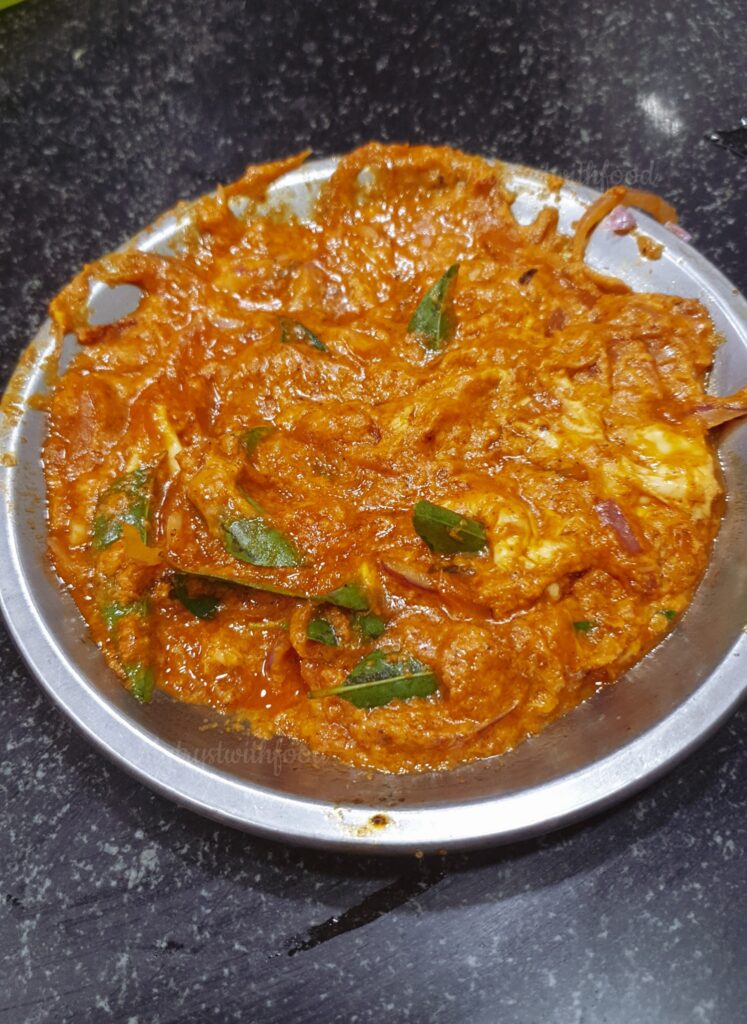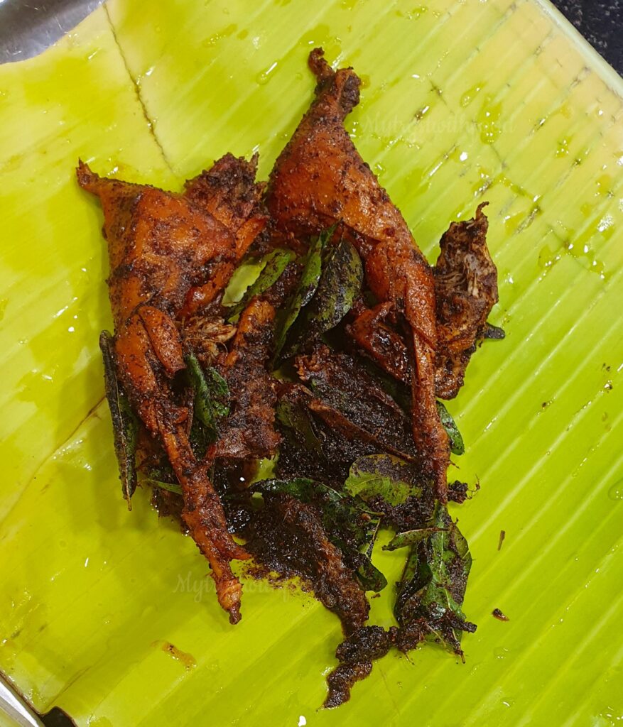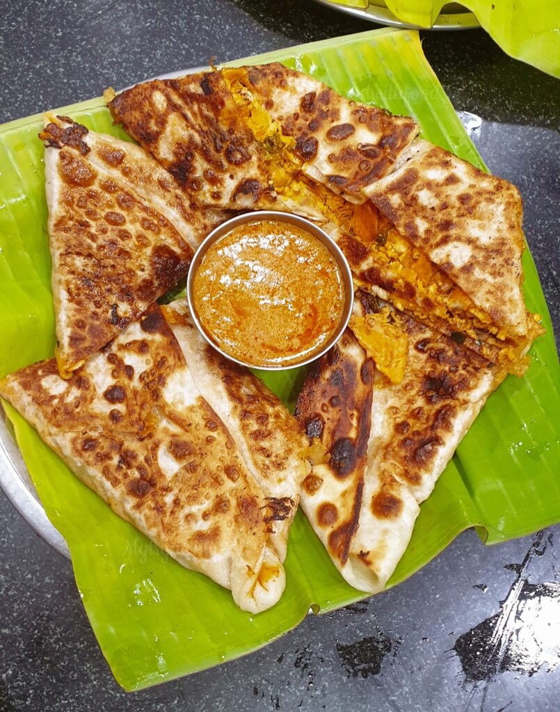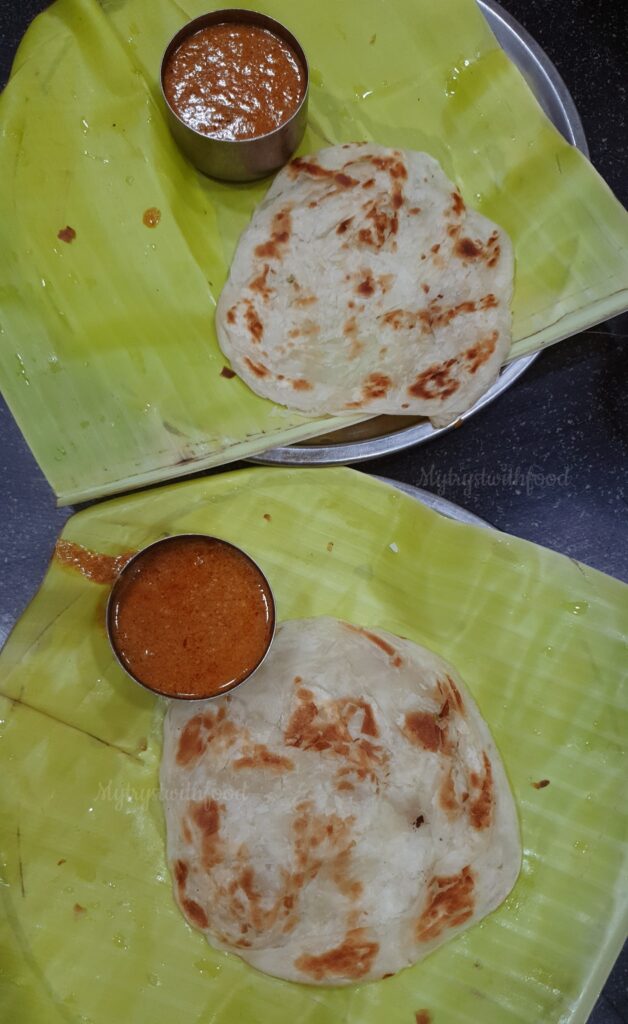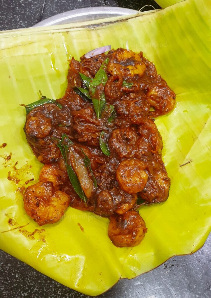 A clear cut case of how much I can be a victim of hype, too. Hype may not be the right word here, but yeah I couldn’t think of a better word, too. This particular stretch near Villianur Railway Station has a lot of eateries. Mainly Parotta stalls that also sells Biryanis. But, Irfan has been spoken about about so many people (read bloggers) that I’ve had already gone hunting a few times before and found them closed. So, this time around, I was in luck as they were open. It was that time during just after lockdown when Dine-ins had resumed. Their USP is Nei Parotta (₹15/pc) as it’s for sure tempting to see them being fried in oil. The sight of the kutti kutti layered plump barottas simmering in hot oil is a vision to behold. But, the simple flaky layered Parotta (₹10/pc) has my heart. I’m a person who prefers salna soaked soft parottas to crispy layered parottas. Their complimentary Salna had a very unique flavor profile and was addictive. The Kadai Pepper Fry (₹80) arrived in a plain plate which got immediately changed into a plate with banana leaf as soon as the waiter saw me clicking pictures. Huh!! So much for the social media hype. Never mind, the dish was brilliant. Naatu Kozhi Laapa (₹230) had a generous amount of filling and certainly was impressive in it’s taste. The person at the cash counter (whom I presume is the owner) was continuously announcing something in the microphone and I could hear the word “Eraa Fry” again and again. Curiosity got the better of me and I ordered the Prawns Fry. It was promptly served in a quarter plate laden with banana leaf. Had to send it back because the Prawns were undercooked. Muttai Chutney (₹40) was good.