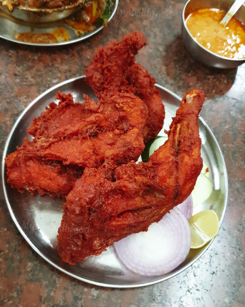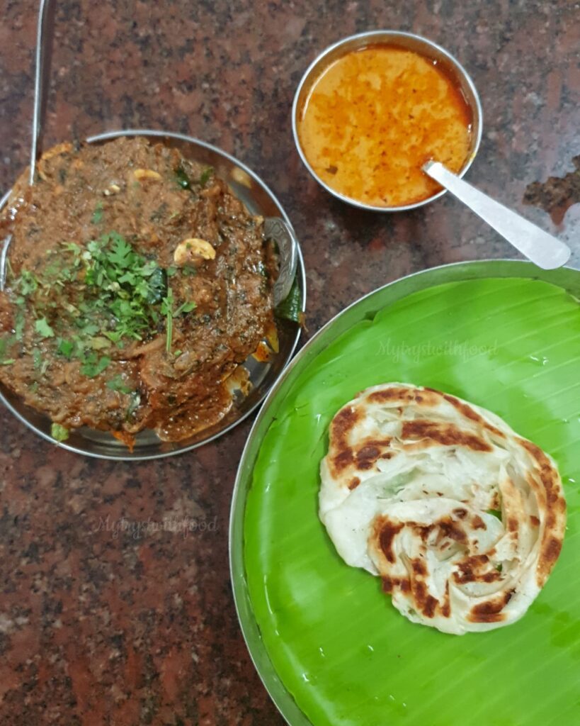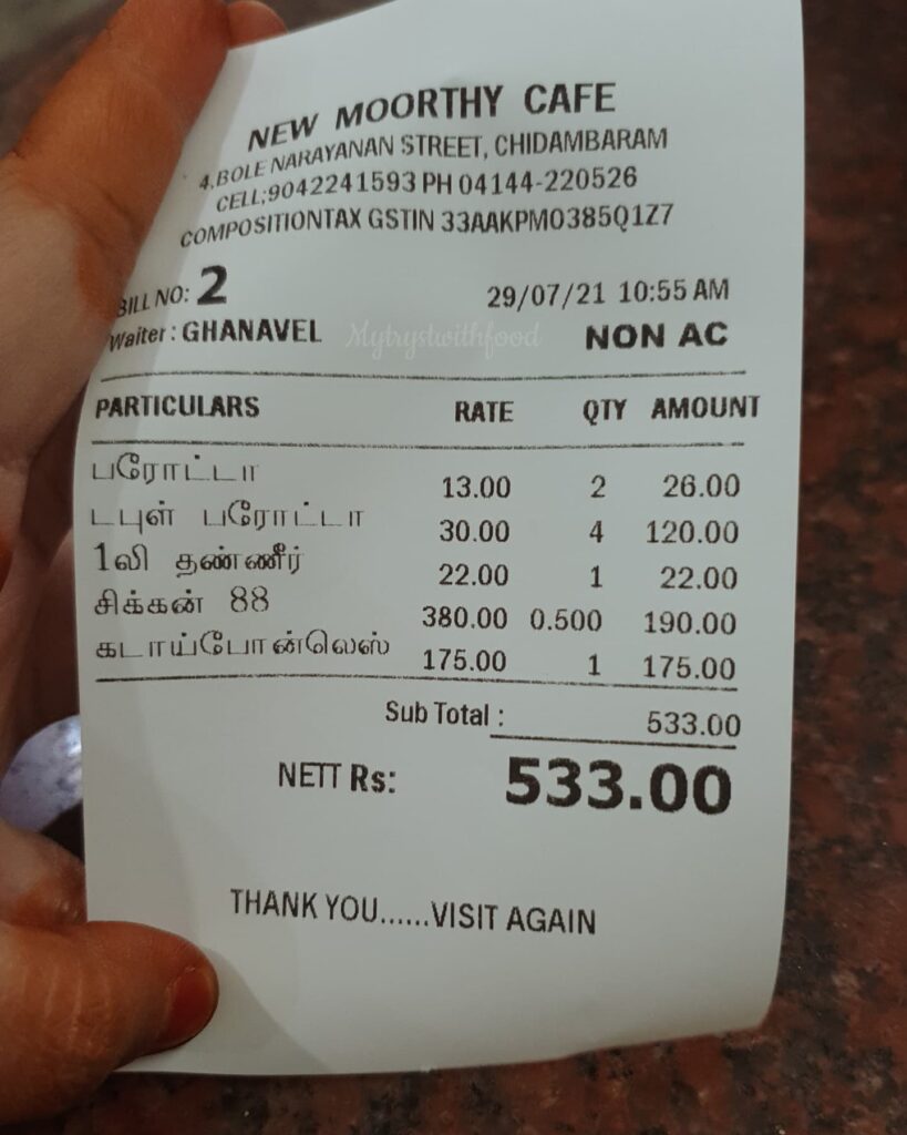 It was at an odd time that we reached Chidambaram. It wasn’t a time when Breakfast was being served nor had the Lunch service started in the other restaurants. We went around hunting for food at new places that I’d bookmarked to try. But, none were ready to serve, yet. So, knocked the doors of our usual pit stop, and they immediately obliged. They accommodated us immediately after finishing their Pooja rituals. All the more reason for my Moorthy Cafe love to grow more.We were starving and the waiter suggested we start the meal right away with their Parottas (₹13/pc) till the Double Parotta (₹30) find it’s way to the table. Settled for my usuals Kadai Chicken (₹175) and Chicken 88 (₹190). As usual, spot on flavours and taste. Hunger adds it’s own extra flavour, too.One of the few places that prints bill in Tamil. Certainly irresistible!